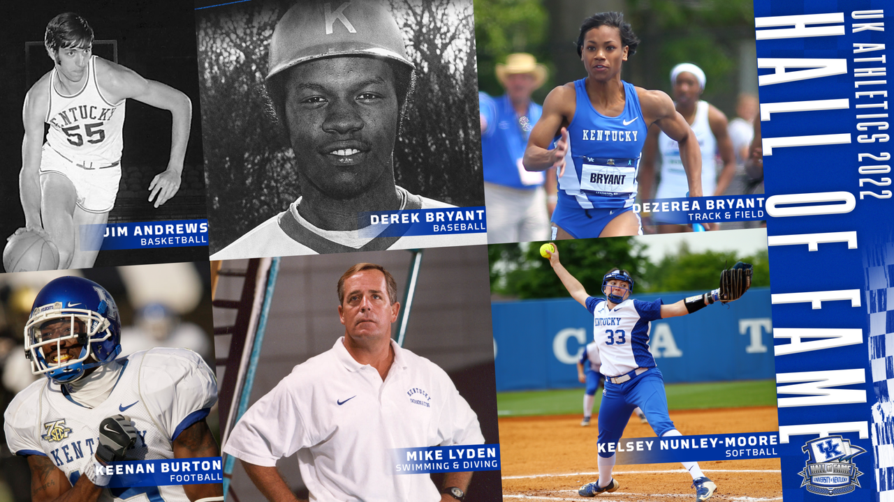 LEXINGTON, Ky. – The University of Kentucky Athletics Hall of Fame Class of 2022 was inducted Thursday night with Jim Andrews (men’s basketball), Derek Bryant (baseball), Dezerea Bryant-Moore (women’s track and field), Keenan Burton (football), Mike Lyden (swimming and diving) and Kelsey Nunley-Moore (softball) officially receiving the honor.