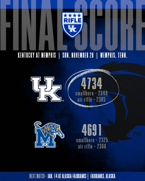 LEXINGTON, Ky. – The No. 3 University of Kentucky rifle kept its momentum going Sunday as it posted an impressive 4734 team score to earn a dual-match victory at No. 13 Memphis. The Tigers scored a 4691 in the match.