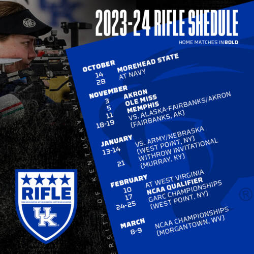 LEXINGTON, Ky. – Looking to continue its high standard of success after earning its third-straight podium finish at last year’s NCAA Championships, the University of Kentucky rifle team has finalized its 2023-24 competition schedule.