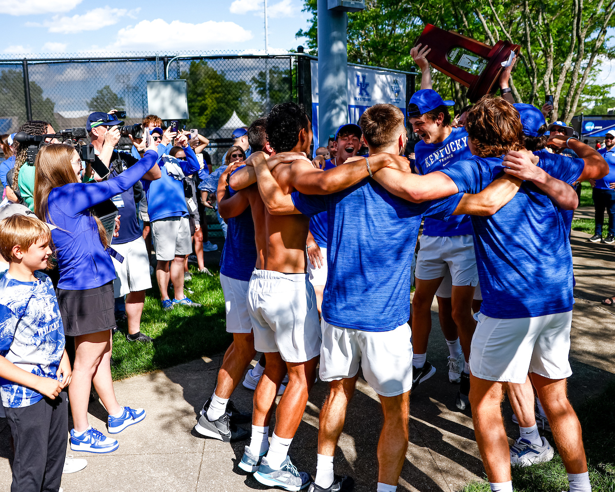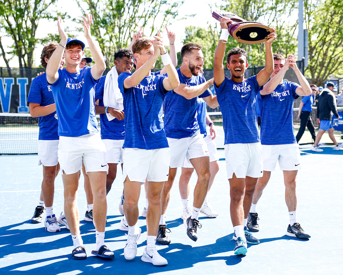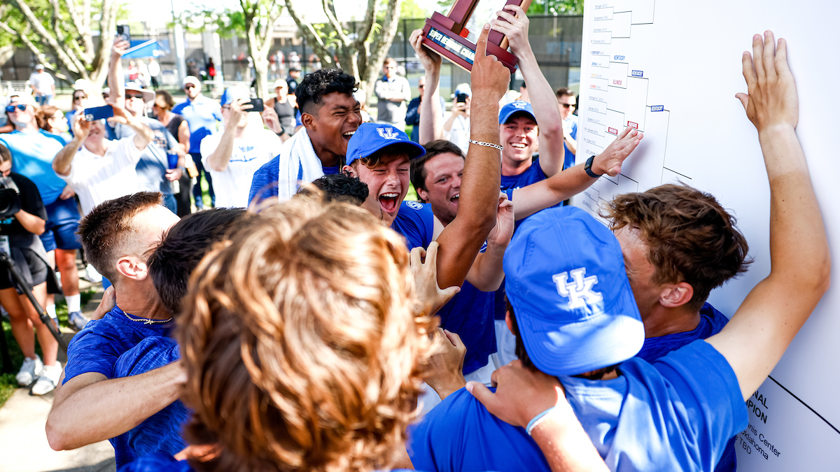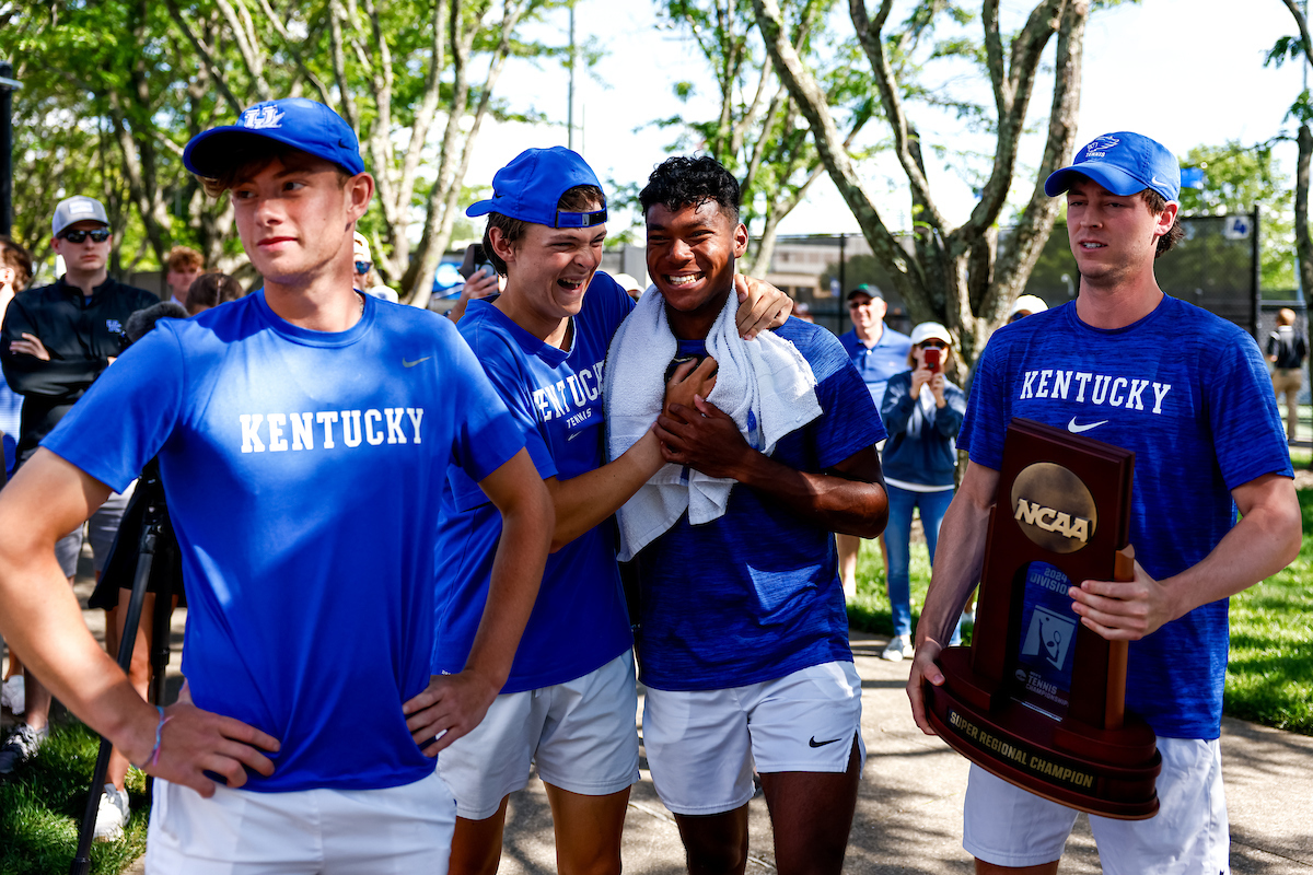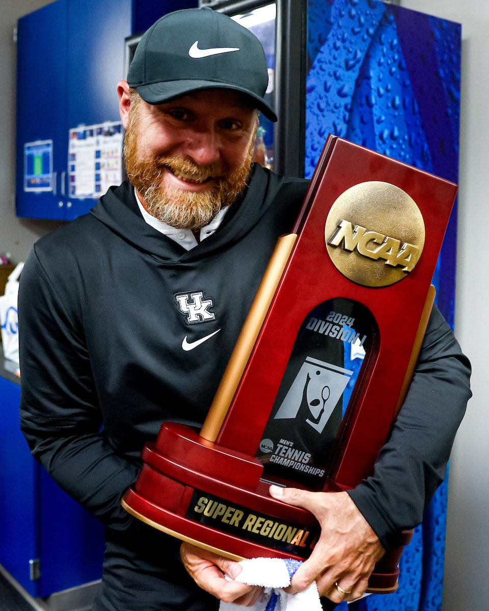 Cedric Kauffmann. Celebration. Trophy. Kentucky defeats Harvard 4-2 and advances to the Elite 8.. Photo by Eddie Justice | UK Athletics