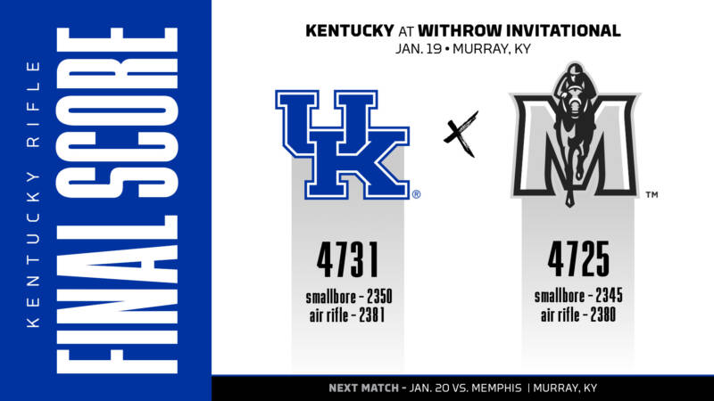 Kentucky posted a 2350 in smallbore and 2381 in air rifle to claim the strong score. Murray State, who annually hosts the seven-team event, scored a 4725 team score with a 2345 in smallbore and 2380 in air rifle. Also competing in the event throughout the weekend was Nebraska (4706), Jacksonville State (4686), North Georgia (4618), UAB (4559) and Memphis.