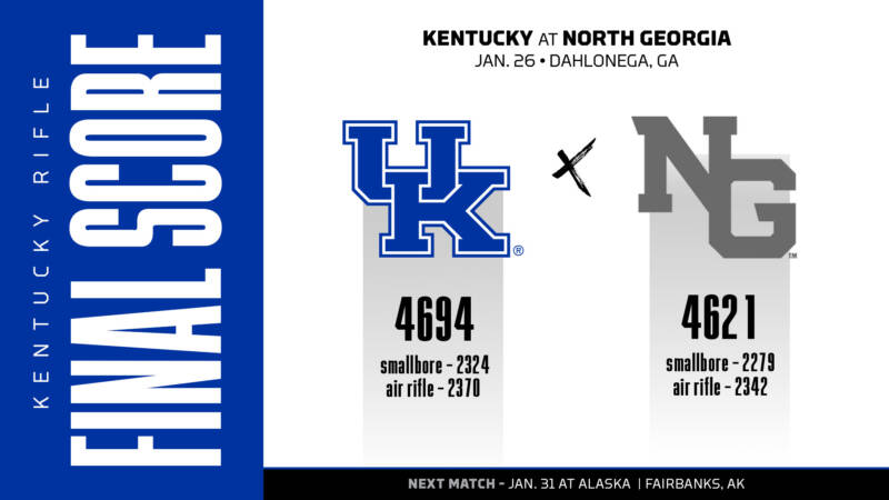 Kentucky, which was using a new squadded lineup Sunday that included several members that have not be in the squadded lineup yet this season, posted a 2324 in smallbore and 2370 in in air rifle for a team score of 4694. North Georgia posted a 2279 in smallbore and 2342 in air rifle for a 4621 team score.