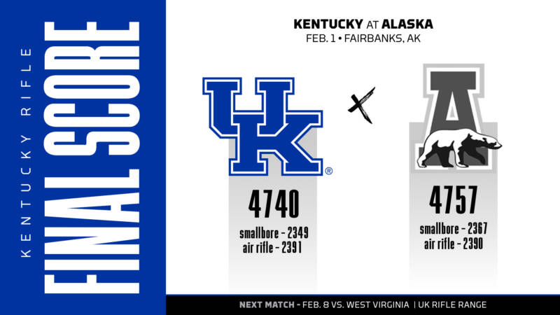 Kentucky scored a 2349 in smallbore and 2391 in air rifle for a 4740 team aggregate score, while Alaska posted a 2367 in smallbore and 2390 in air rifle for a 4757 team aggregate. The two teams were supposed to meet Friday in a dual match as well, but due to UK’s equipment not making it to Fairbanks until early Saturday morning, the match had to be canceled.
