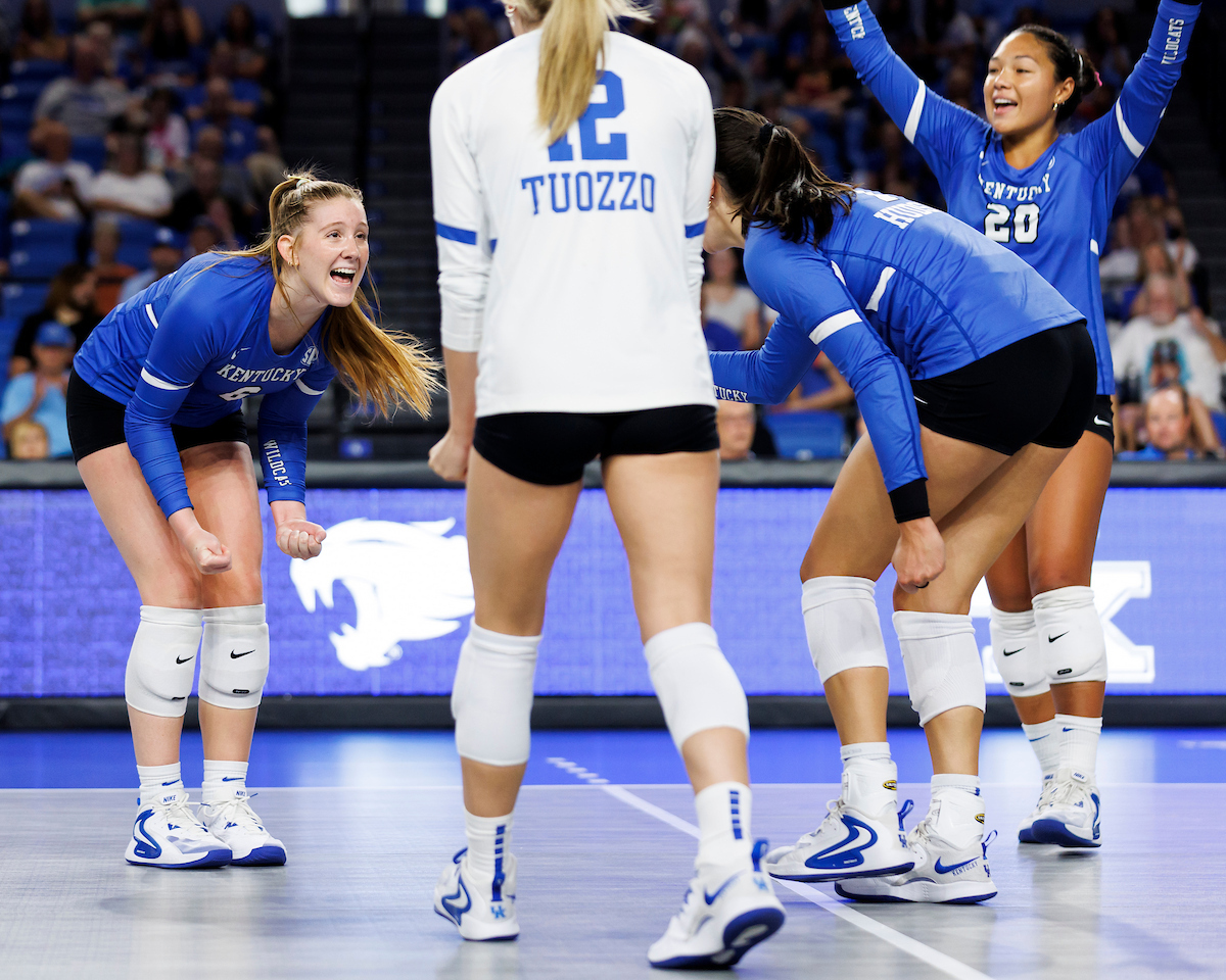 Ava Sarafa, Kennedy Washington, Jordyn Dailey, and Molly Tuozzo. Kentucky Volleyball Blue White Game. Photo by Caleb Bowlin | UK Athletics